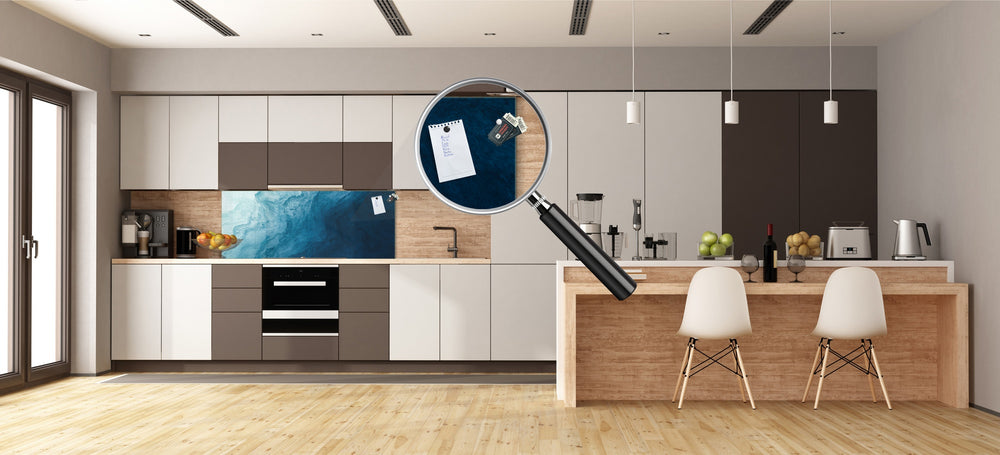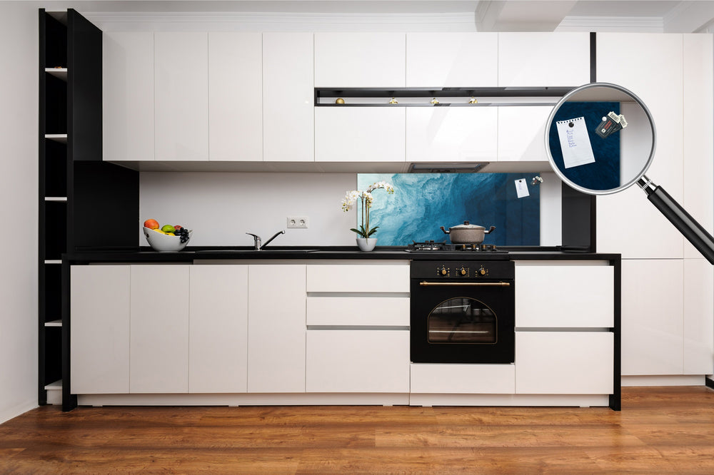 Our Glass Splashbacks can be used as: kitchen anti-splash panel, magnetic surface kitchen backsplash, bathroom backsplash, magnetic splashback for wall protection, protective panel for kitchen, splashbacks for bathroom sinks, kitchen memo board and similar.