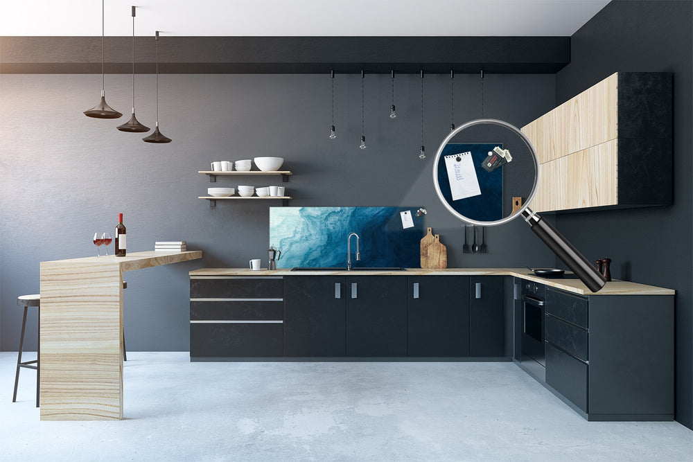 The metal back-coating on the splashback turns the glass surface into a magnetic one which allows you to stick to it your notes, papers, recipes, tickets with the use of very strong magnets (neodymium magnets) and thus have additional space for your daily reminders.
