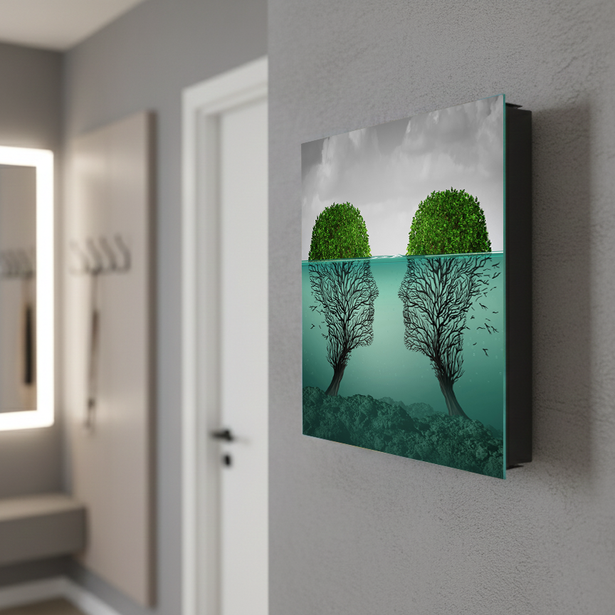 - DREI IN EINS: Schlüsselschrank – Magnettafel aus Glas für Mitteilungen – kunstvolle Dekoration.