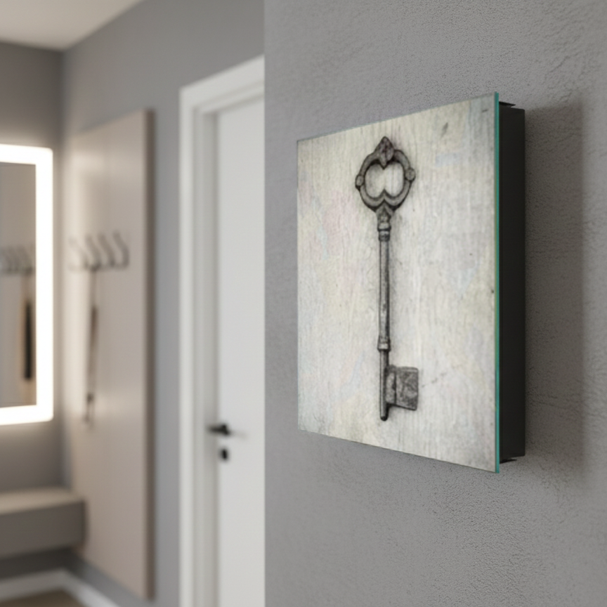 Nuestra Caja de Llaves tiene diseño de Tu elección y es también una Pizarra Magnética de Cristal para las notas y apuntes de toda tu familia!