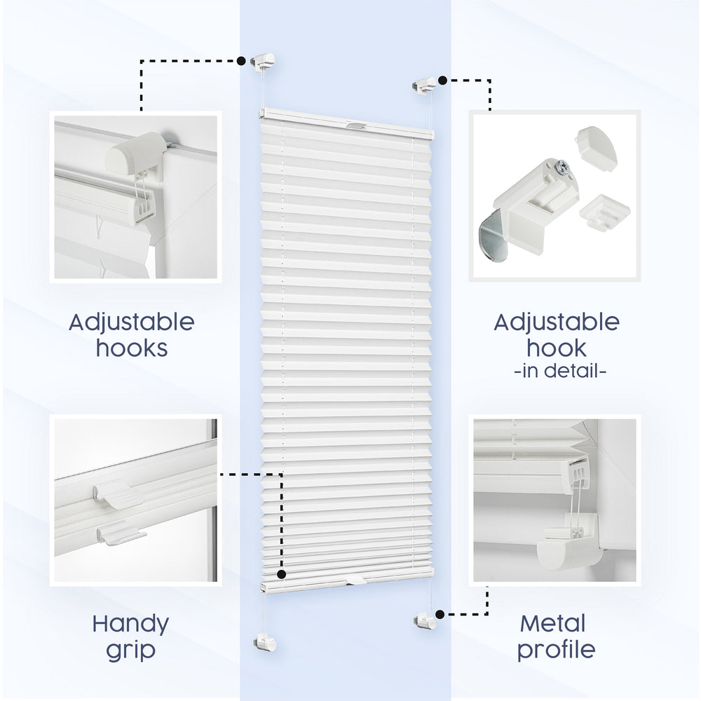 Enjoy hassle-free installation with our made-to-measure custom pleated blinds featuring non-drill adhesive fixings for damage-free mounting. Perfect for renters or anyone looking for stylish window coverings with excellent light filtering and privacy control.