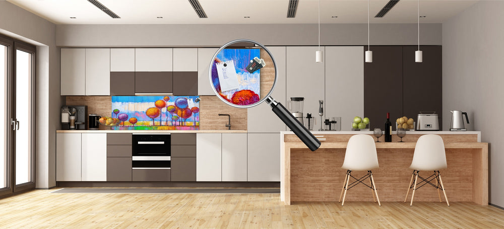 Our Glass Splashbacks can be used as: kitchen anti-splash panel, magnetic surface kitchen backsplash, bathroom backsplash, magnetic splashback for wall protection, protective panel for kitchen, splashbacks for bathroom sinks, kitchen memo board and similar.