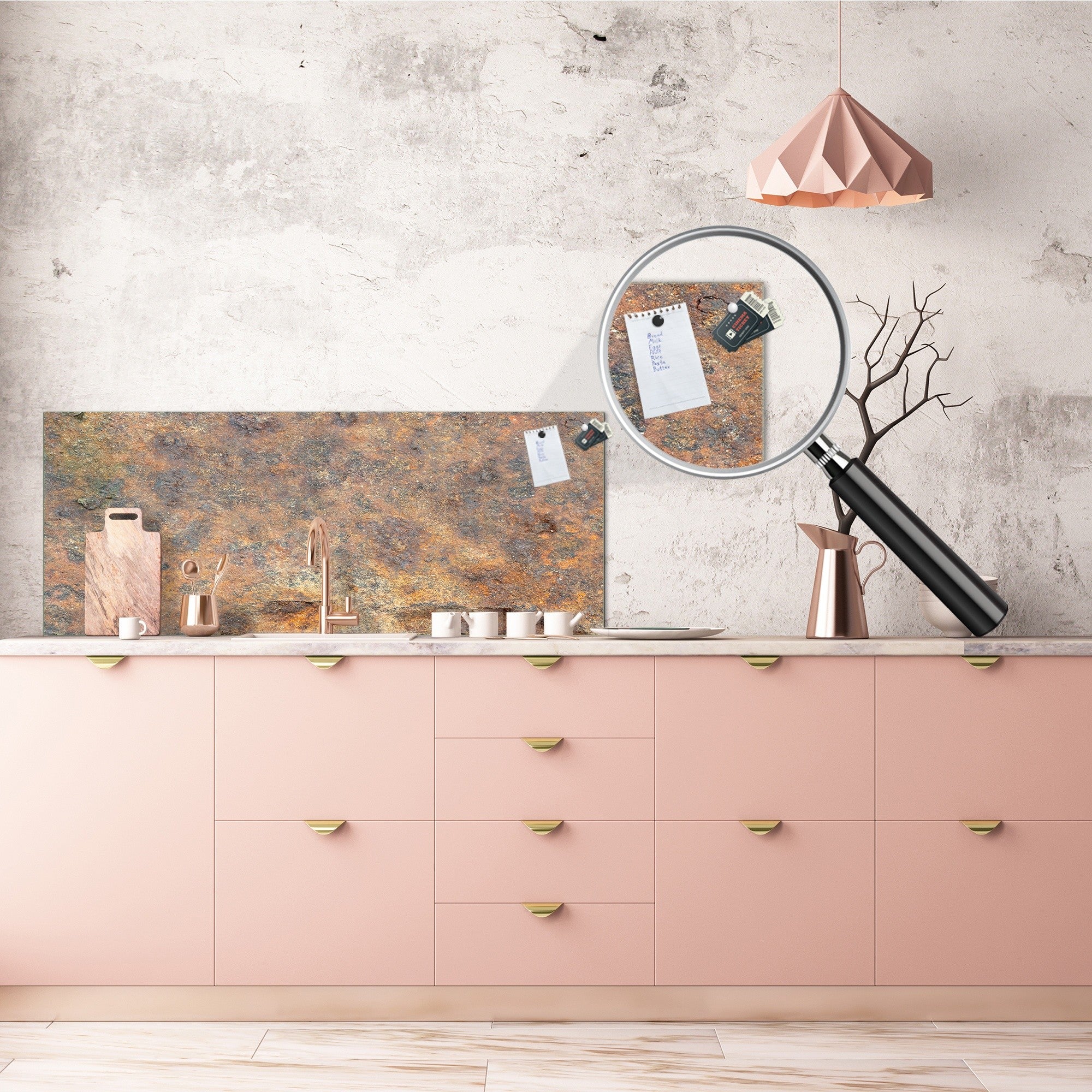 The metal back-coating on the splashback turns the glass surface into a magnetic one which allows you to stick to it your notes, papers, recipes, tickets with the use of very strong magnets (neodymium magnets) and thus have additional space for your daily reminders.