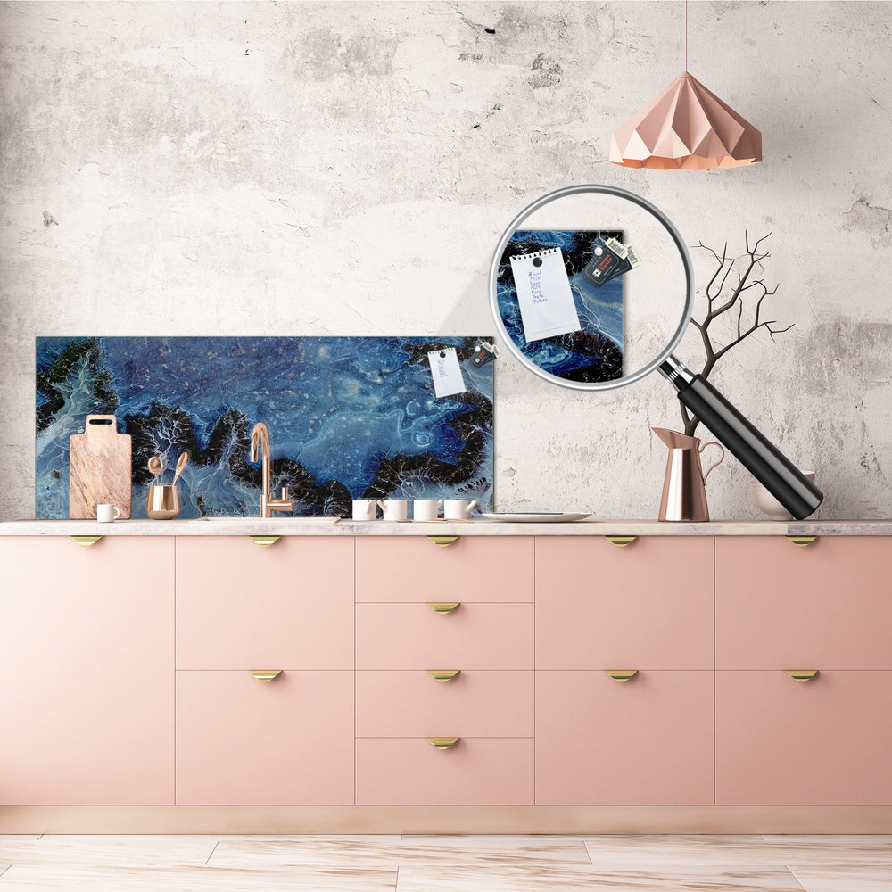 Our Glass Splashbacks can be used as: kitchen anti-splash panel, magnetic surface kitchen backsplash, bathroom backsplash, magnetic splashback for wall protection, protective panel for kitchen, splashbacks for bathroom sinks, kitchen memo board and similar.